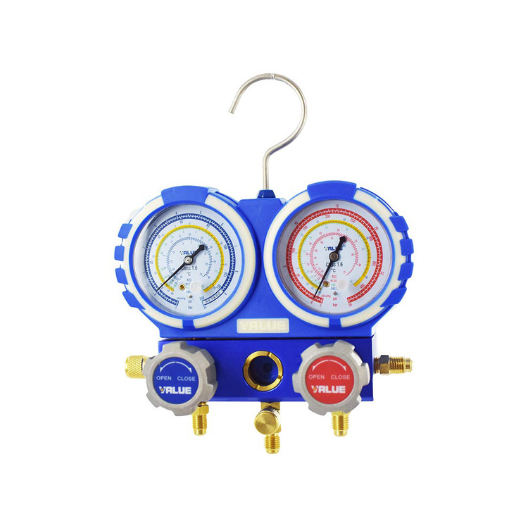 شیر دستی، شیلنگ و فشارنمای سمت چپ که به رنگ آبی میباشند، قسمت فشار کم منیفولد را تشکیل میدهند. این بخش مربوط به بخش فشار ضعیف و یا مرکب است که دارای دو نوع درجه میباشد. درجه بالای صفر که تا 350psi تقسیم بندی شده است و برای شارژ ماده سرمازا بکار گرفته میشود؛ همچنین به قسمت فشار کم سیکل تبرید نیز متصل میشوند. درجه دوم، فشار زیر صفر است که هنگام ایجاد وکیوم و هواگیری از سیستم بکار میرود و 30-~0 اینچ جیوه درجهبندی شده است.