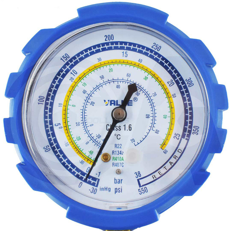 شیر دستی، شیلنگ و فشارنمای سمت چپ که به رنگ آبی میباشند، قسمت فشار کم منیفولد را تشکیل میدهند. این بخش مربوط به بخش فشار ضعیف و یا مرکب است که دارای دو نوع درجه میباشد. درجه بالای صفر که تا 550psi تقسیم بندی شده است و برای شارژ ماده سرمازا بکار گرفته میشود؛ همچنین به قسمت فشار کم سیکل تبرید نیز متصل میشوند. درجه دوم، فشار زیر صفر است که هنگام ایجاد وکیوم و هواگیری از سیستم بکار میرود و 30-~0 اینچ جیوه درجهبندی شده است.